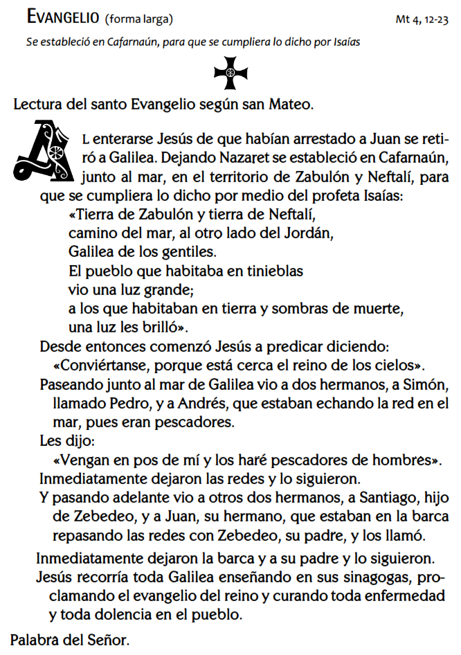 Antífona: Caminando junto al mar de Galilea, vio a dos hermanos, Pedro y Andrés, y los llamó: "Venid conmigo y os haré pescadores de hombres".
